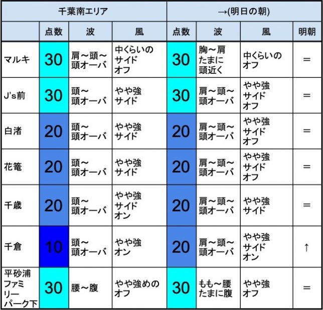9月26日(土)最終〜明日9月27日(日)朝の千葉南の波 2020年9月26日 / U / コメントする 【千葉南エリア】-“・明朝の千葉南エリアは肩〜頭〜頭オーバくらいの波、オフショアベースの風、それほど良くなくても場所を選んで多少できそうなコンディションでのスタートとなりそうです。- ・マルキ、J’s前、平砂浦ファミリーパーク下、あたりでは多少期待”