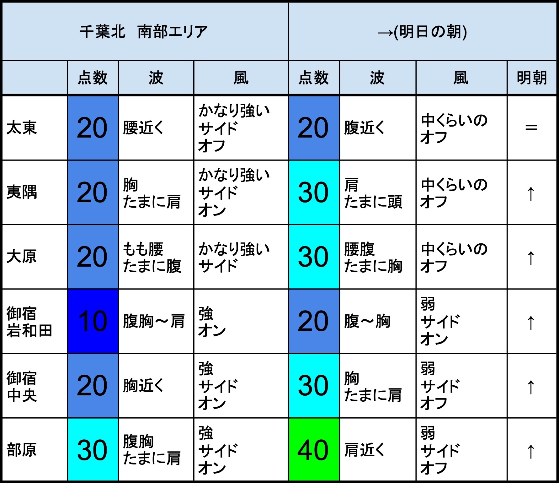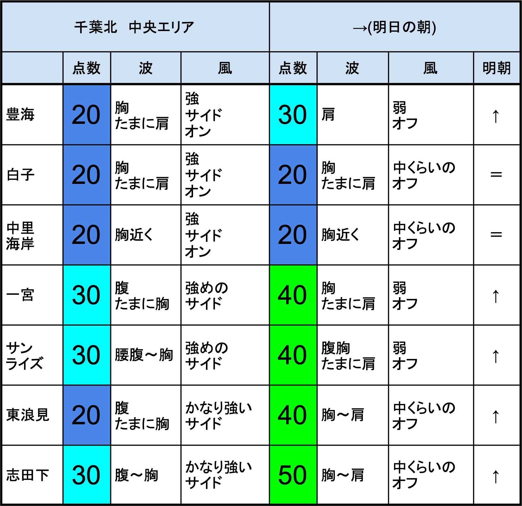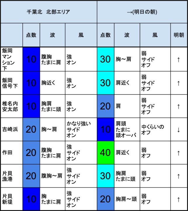 【千葉北 南部エリア】-“・明朝の千葉北 南部エリアは胸くらいの波、オフショアベースの風、多少できそうなコンディションでのスタート-