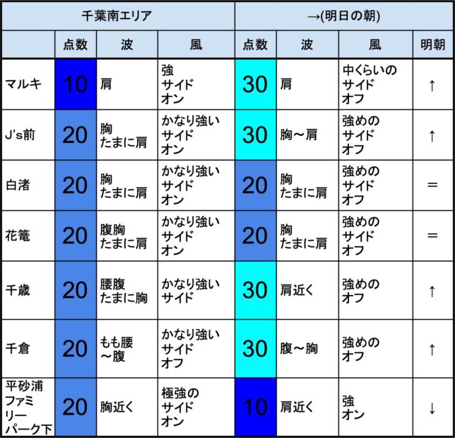 【千葉南エリア】-“・明朝の千葉南エリアは胸〜肩くらいの波、オフショアベースの風、それほど良くなくても場所を選んで多少できそうなコンディションでのスタート-