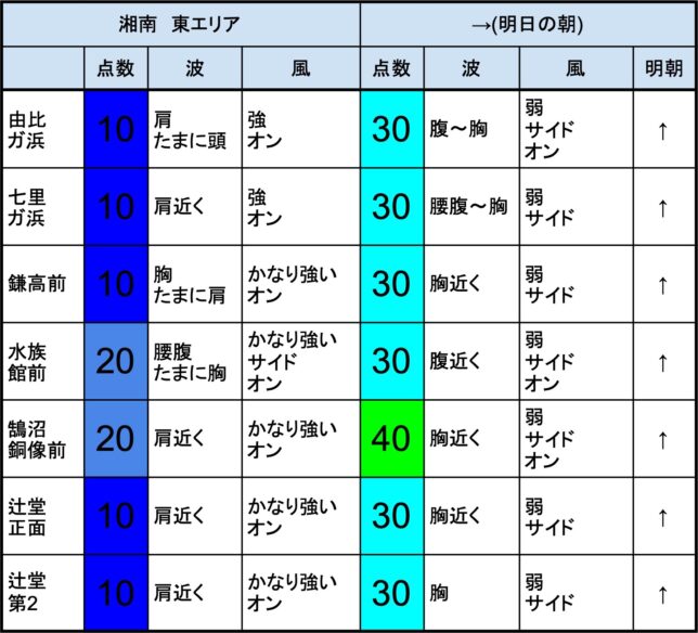 【湘南東エリア】-“・明朝の湘南 東エリアは腹〜胸くらいの波、弱めのオンショアベースの風、多少できそうなコンディションでのスタート-