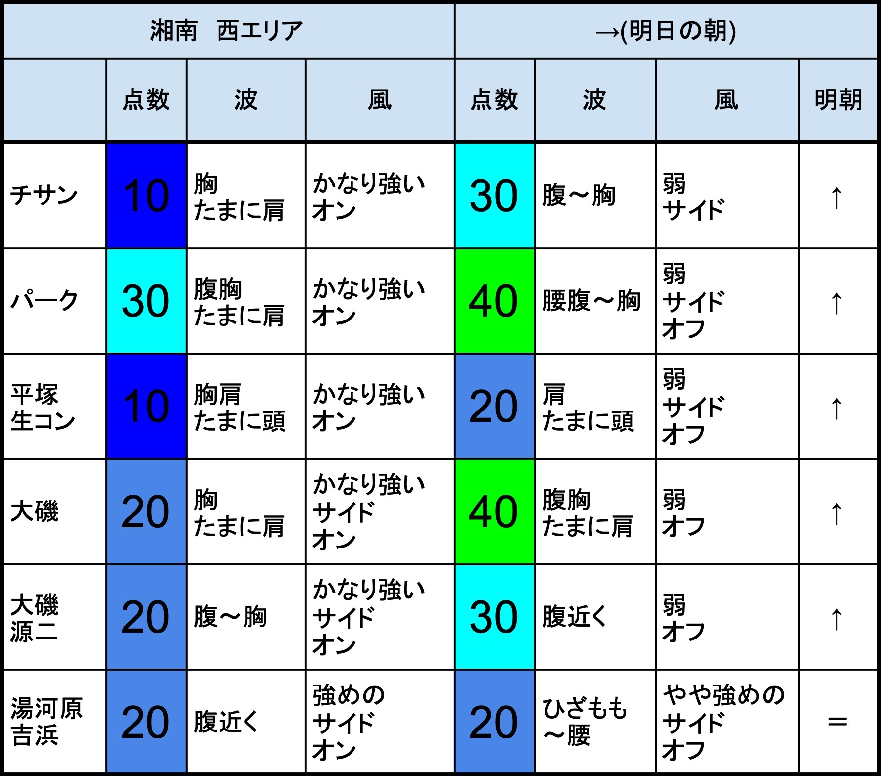 【湘南西エリア】-“・明朝の湘南 西エリアは腹たまに胸くらいの波、弱めのオフショアベースの風、多少できそうなコンディションでのスタート-
