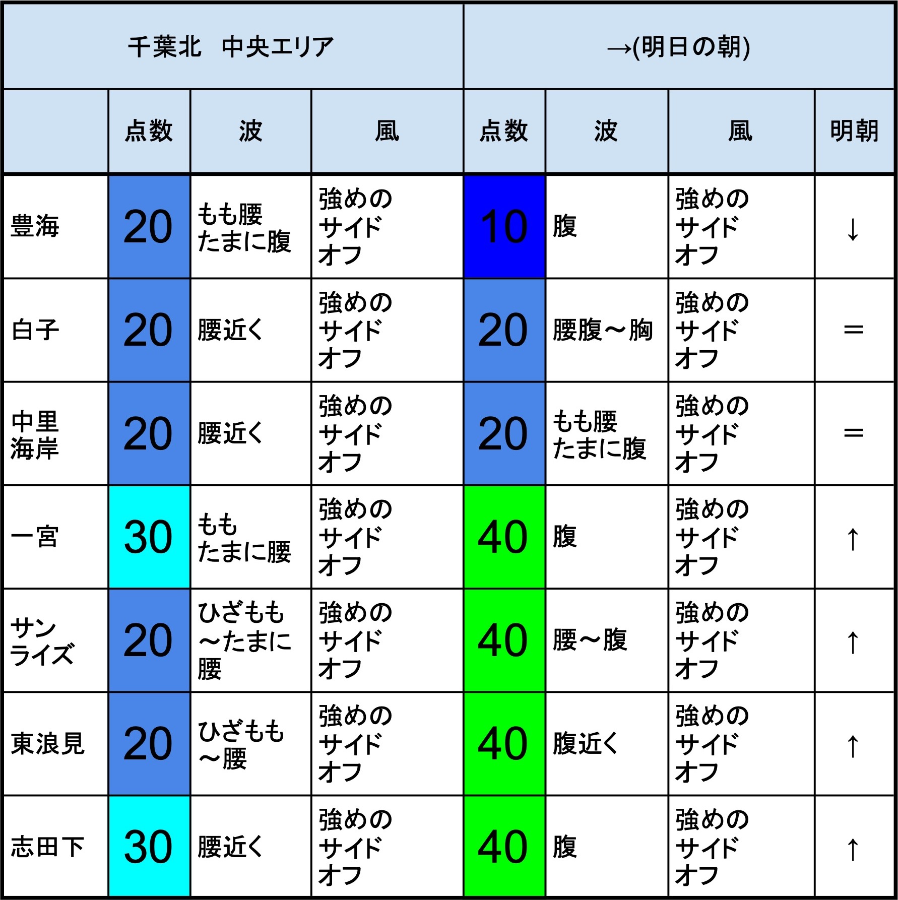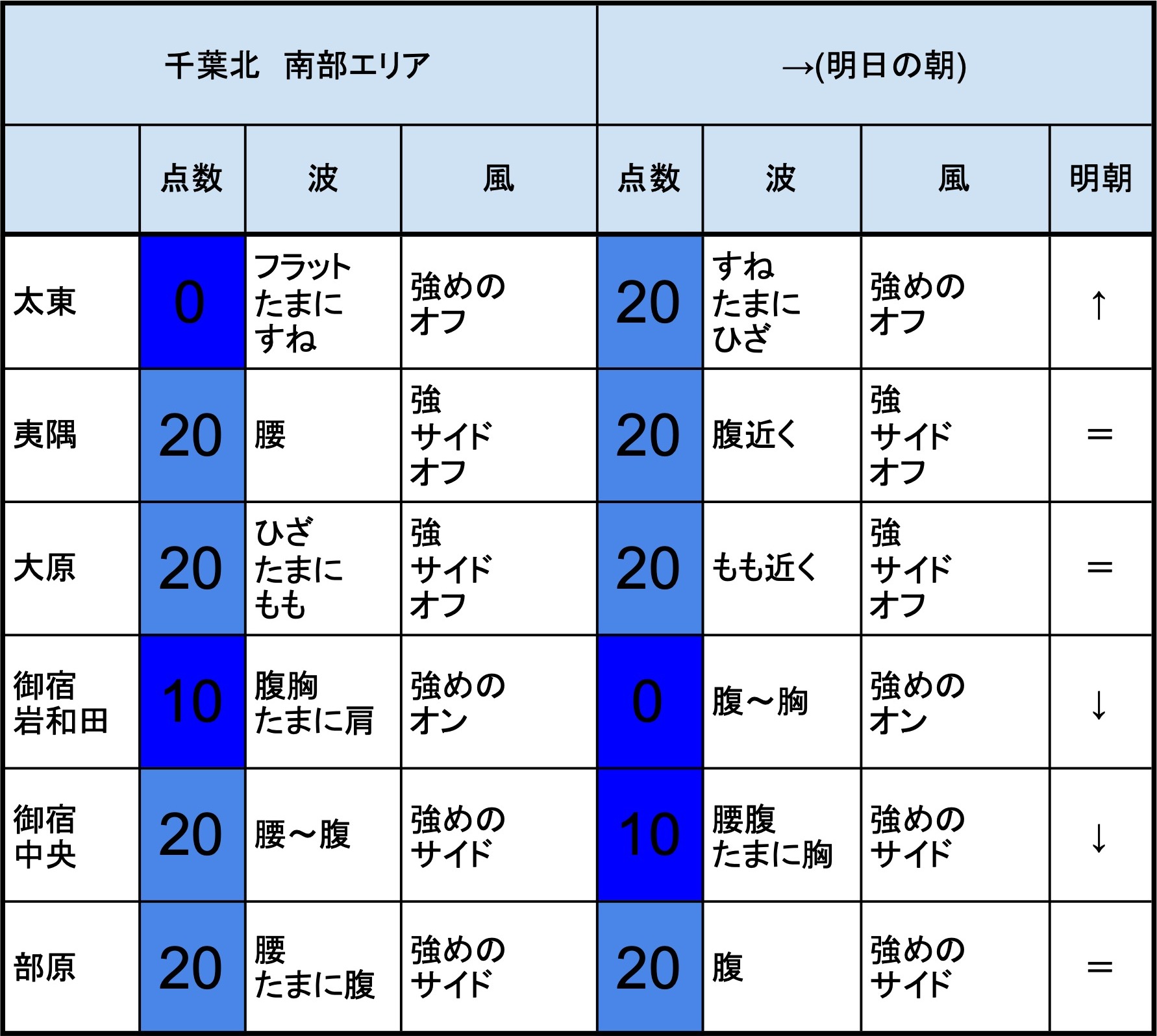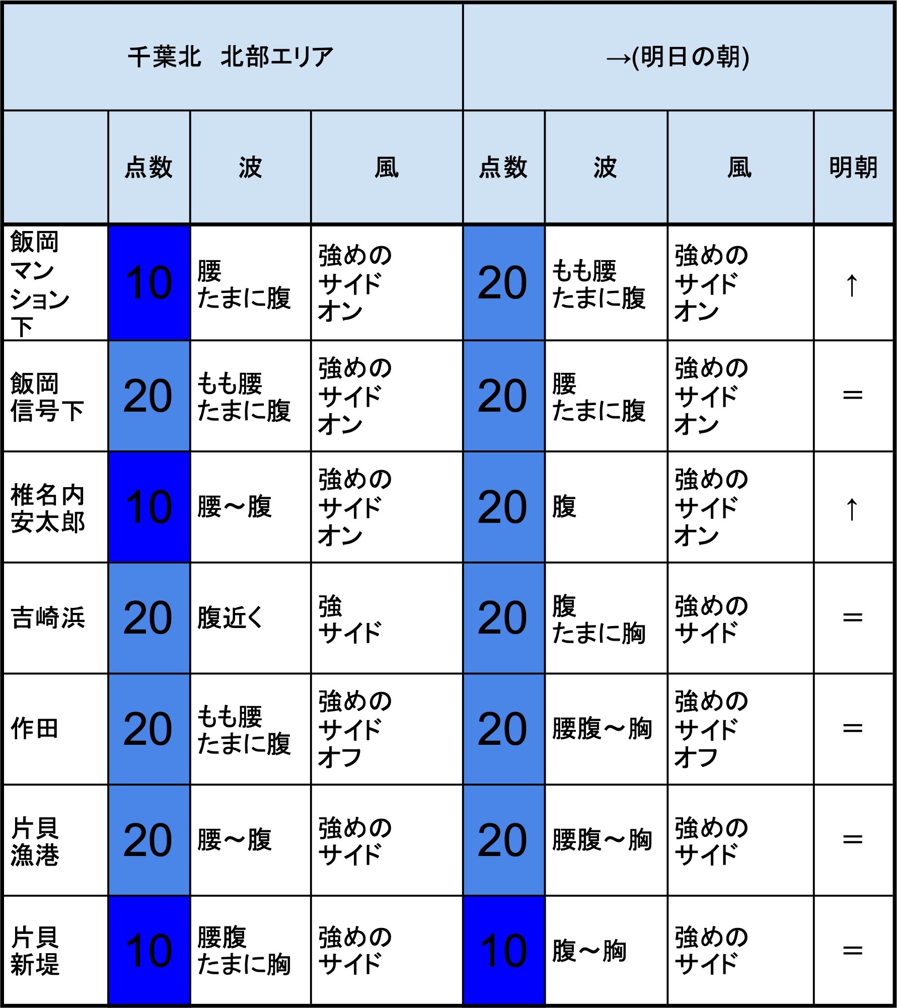【千葉北 中央エリア】-“・明朝の千葉北 中央エリアは腹近くくらいの波、オフショアベースの風、多少できそうなコンディションでのスタート-