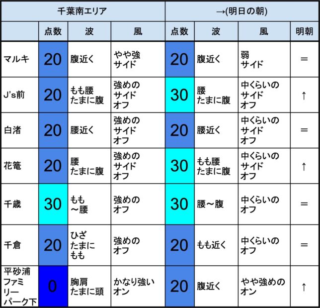 7月11日(火)最終〜明日7月12日(水)朝の千葉南の波 2023年7月11日 / U / コメントする 【千葉南エリア】-“・明朝の千葉南エリアはもも腰〜腹くらいの波、オフショアベースの風、それほど良くなくても場所を選んで多少できそうなコンディションでのスタート- ・J’s前、花篭、千歳、あたりでは多少期待”