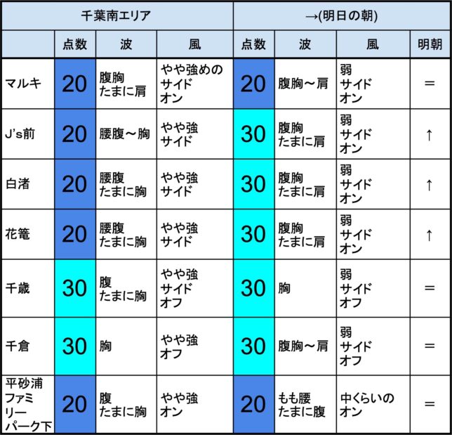 【千葉南エリア】-“・明朝の千葉南エリアは腹胸たまに肩くらいの波、弱めのオンショアベースの風、多少できそうなコンディションでのスタート-