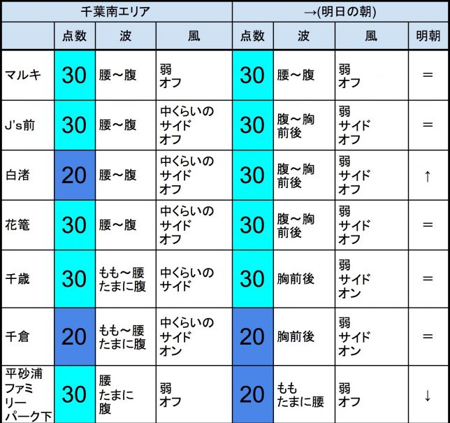 【千葉北 南部エリア】-“・明朝の千葉北 南部エリアは腹〜胸前後くらいの波、弱めのオフショアベースの風、それほど良くなくても多少できそうなコンディションでのスタートとなりそうです。-