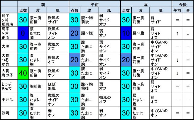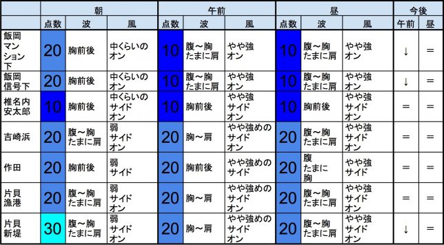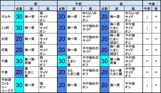 ・今もこの後もそれなりな感じで、早めなら、一宮、東浪見、志田下、片貝新堤、サンライズ、御宿中央、部原、あたり、後半なら、一宮、サンライズ、部原、あたりが狙い目でしょうか。-“