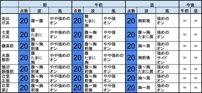 【千葉北 南部エリア】-“・千葉北 南部エリアは腹〜胸〜肩くらいの波、弱めの風のスタート、いまいちなコンディションで、午前から昼にかけても状況はあまり変わらなさそうです。午後から夕方にかけてもコンディションはあまり変わらなさそうです。-