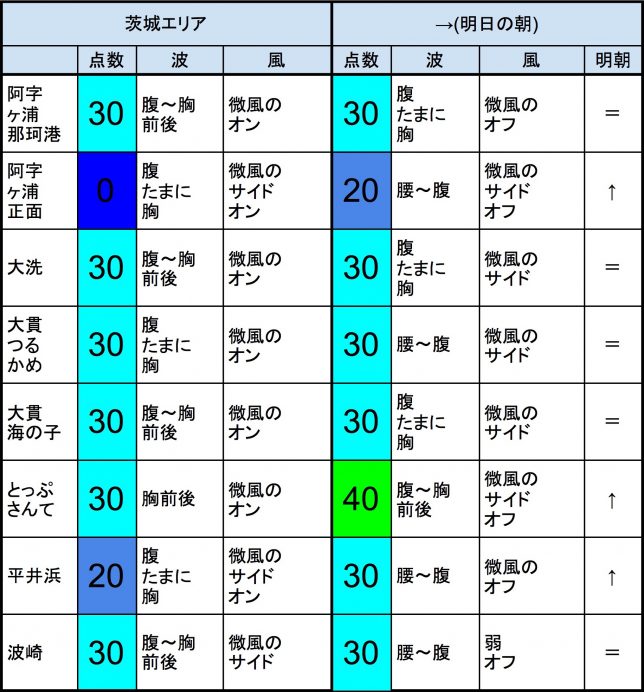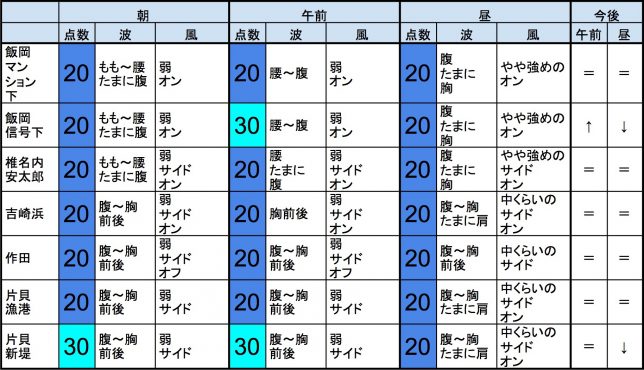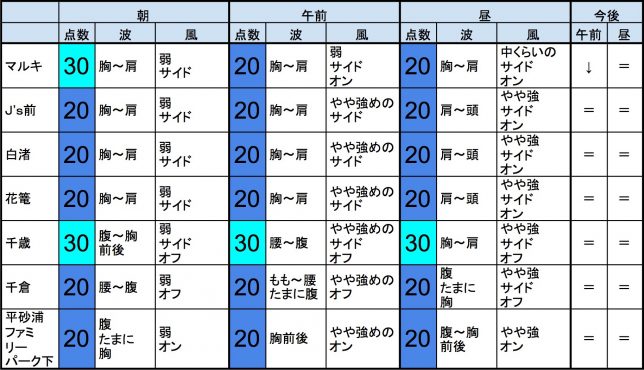 ・今もこの後もそれなりな感じで、早めなら、東浪見、片貝新堤、一宮、サンライズ、志田下、部原、あたり、後半なら、一宮、サンライズ、東浪見、志田下、あたりが狙い目でしょうか。-“