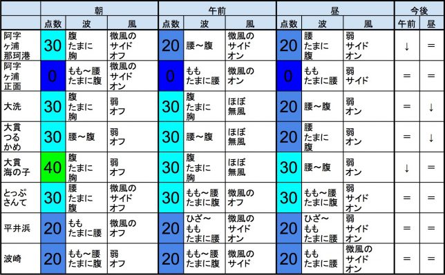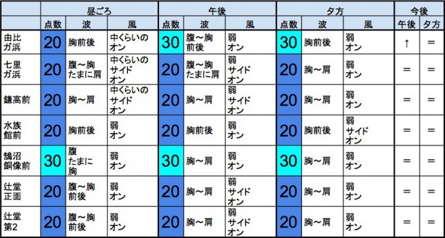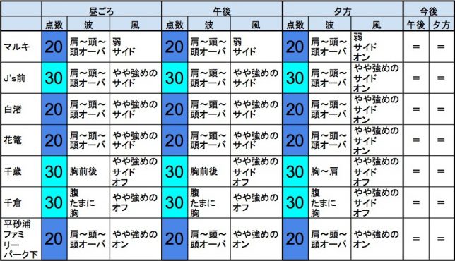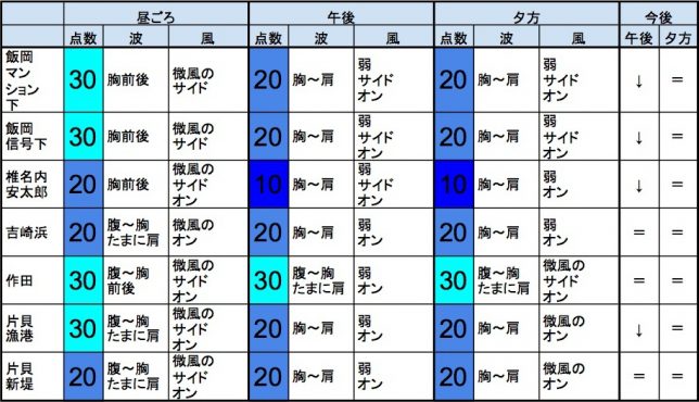 ・今もこの後もそれなりな感じで、早めなら、東浪見、志田下、部原、飯岡マンション下、飯岡信号下、作田、片貝漁港、豊海、一宮、サンライズ、夷隅、大原、御宿岩和田、御宿中央、あたり、後半なら、作田、豊海、一宮、夷隅、御宿中央、あたりが狙い目でしょうか。-