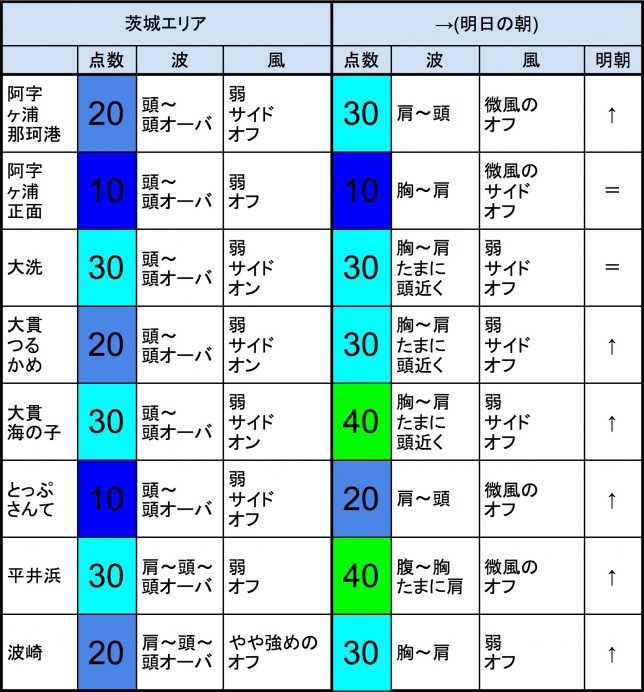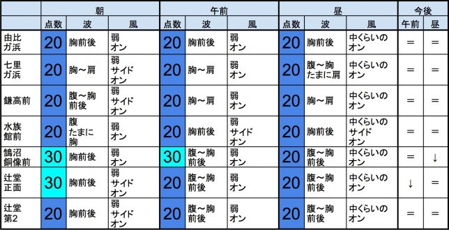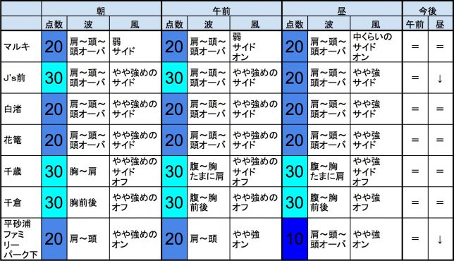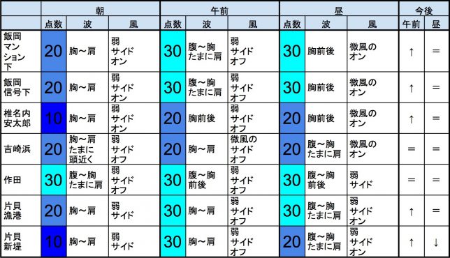 ・今もこの後もそれなりな感じで、早めなら、一宮、サンライズ、東浪見、志田下、作田、夷隅、大原、御宿中央、部原、あたり、後半なら、飯岡マンション下、飯岡信号下、作田、片貝漁港、豊海、夷隅、大原、御宿中央、部原、あたりが狙い目でしょうか。-“