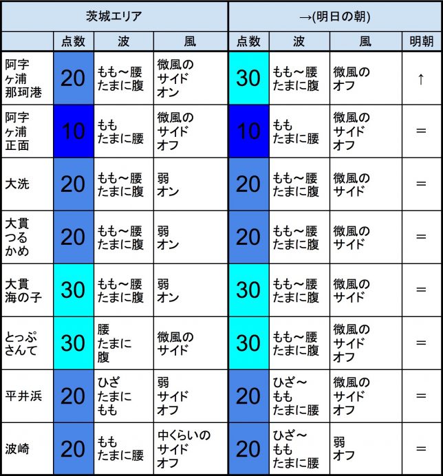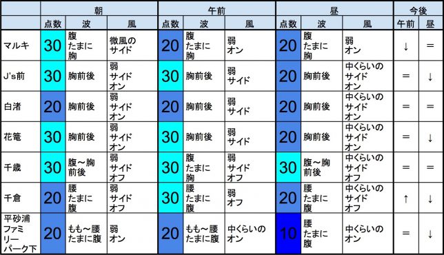 【千葉北 南部エリア】-・千葉北 南部エリアは腹〜胸くらいの波、弱めの風のスタート、いまいちなコンディションで、午前から昼にかけても状況はあまり変わらなさそうです。午後から夕方にかけてコンディションが多少上向いてきそうです。-