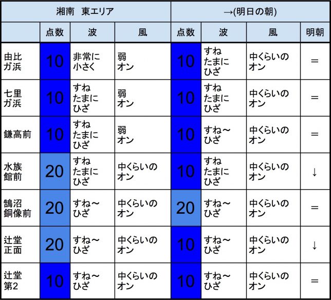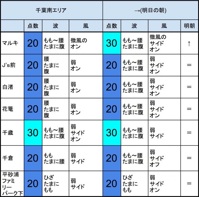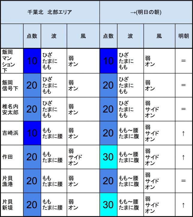 【千葉北 北部エリア】-“・明朝の千葉北 北部エリアはもも〜腰〜腹くらいの波、弱めのオンショアベースの風、いまいちなコンディションでのスタートとなりそうです。-