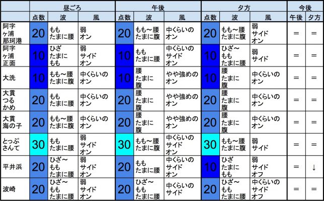 【千葉北 南部エリア】-・明朝の千葉北 南部エリアはもも〜腰〜腹くらいの波、弱めのオンショアベースの風、いまいちなコンディションでのスタートとなりそうです。-