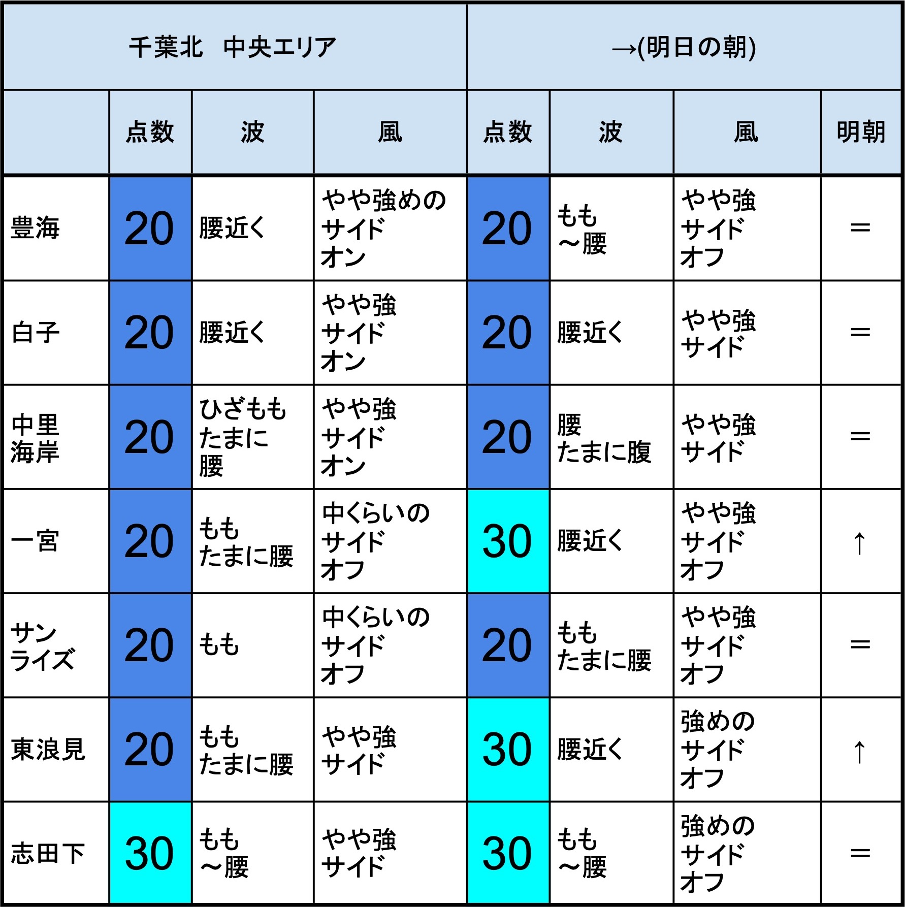 【千葉北 南部エリア】-“・明朝の千葉北 南部エリアは腰近くくらいの波、弱めのオフショアベースの風、それほど良くなくても場所を選んで多少できそうなコンディションでのスタート-