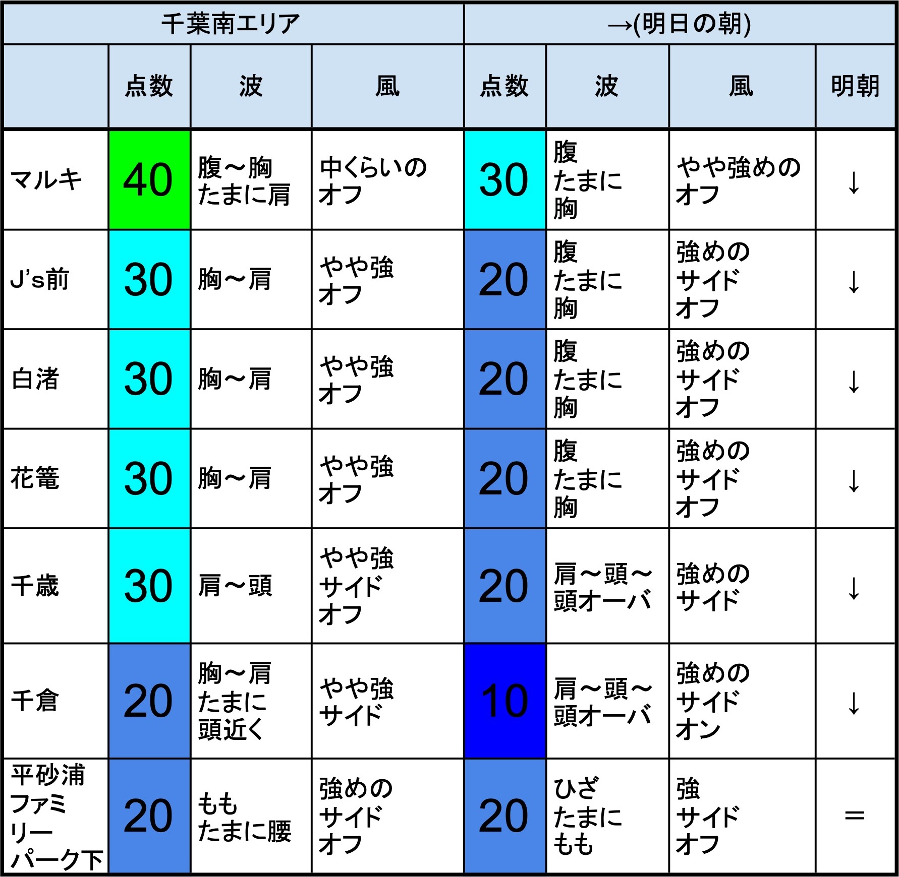 10月10日(火)最終〜明日10月11日(水)朝の千葉南の波 2023年10月10日 / U / コメントする 【千葉南エリア】-“・明朝の千葉南エリアは腹〜胸くらいの波、オフショアベースの風、いまいちなコンディションでのスタート- ・マルキ、あたりでは多少期待”