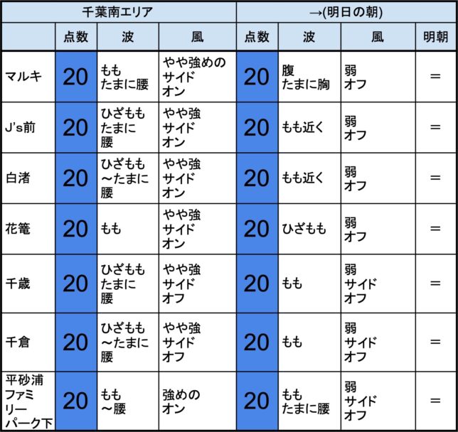 6月9日(金)最終〜明日6月10日(土)朝の千葉南の波 2023年6月9日 / U / コメントする 【千葉南エリア】-“・明朝の千葉南エリアは腹くらいの波、オフショアベースの風、それほど良くなくても場所を選んで多少できそうなコンディションでのスタート- ・J’s前、白渚、花篭、千歳、千倉、あたりでは多少期待”