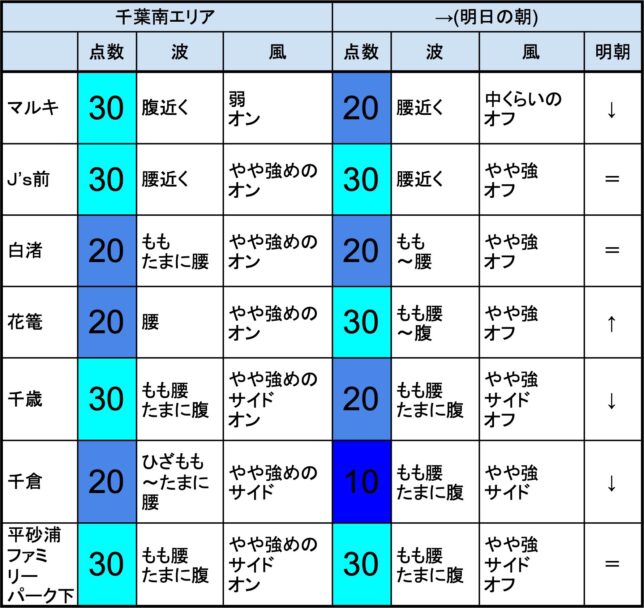 3月3日(金)最終〜明日3月4日(土)朝の千葉南の波 2023年3月3日 / U / コメントする 【千葉南エリア】-“・明朝の千葉南エリアは腰くらいの波、オフショアベースの風、プアなコンディションでのスタート- ・J’s前、花篭、平砂浦ファミリーパーク下、あたりでは多少期待”