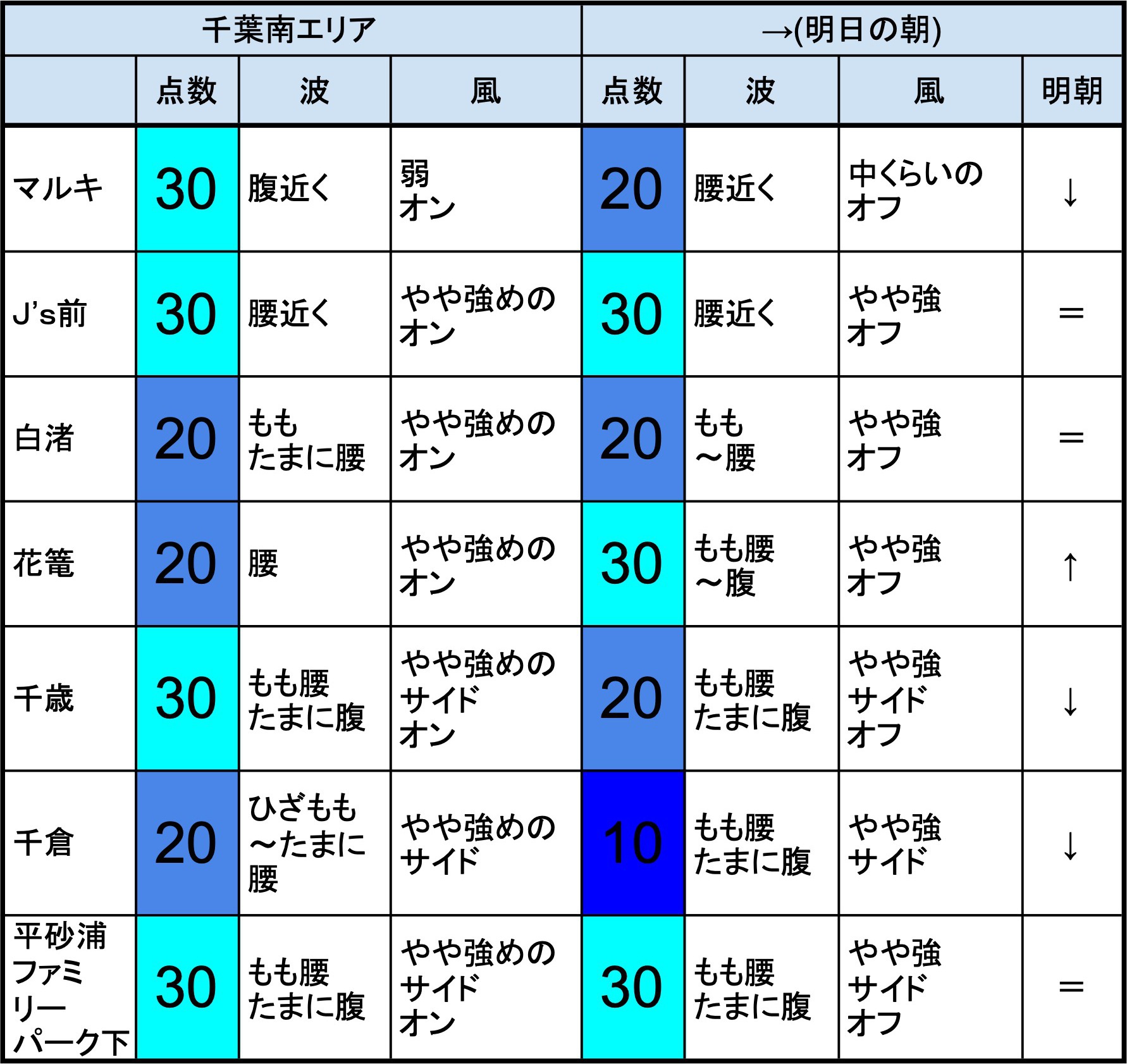 3月7日(火)最終〜明日3月8日(水)朝の千葉南の波 2023年3月7日 / U / コメントする 【千葉南エリア】-“・明朝の千葉南エリアはもも腰たまに腹くらいの波、オンショアベースの風、いまいちなコンディションでのスタート- ・マルキ、あたりでは多少期待”
