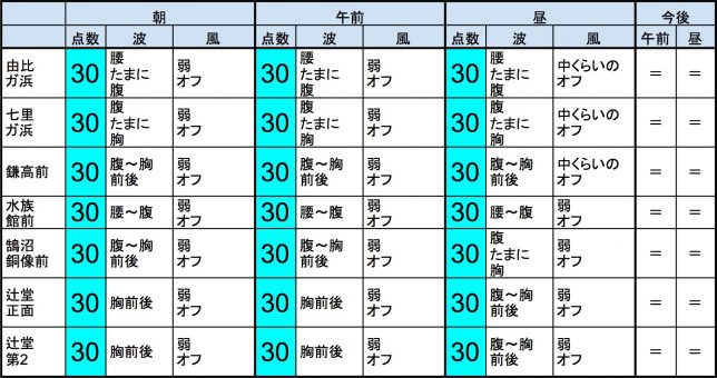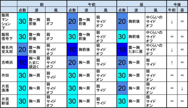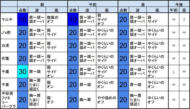 【千葉北 南部エリア】-“・千葉北 南部エリアは肩〜頭〜頭オーバくらいの波、弱めの風のスタート、それほど良くなくても多少できそうなコンディションで、午前から昼にかけてもコンディションはそのままキープしそうです。午後から夕方にかけてもコンディションはそのままキープしそうです。-“