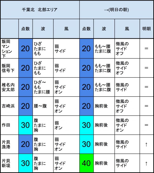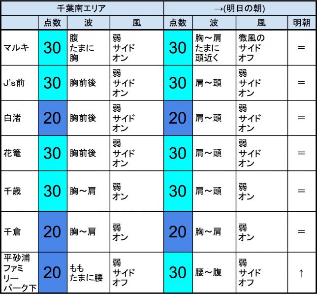【千葉北 南部エリア】-“・明朝の千葉北 南部エリアは胸前後くらいの波、弱めの風、多少できそうなコンディションでのスタートとなりそうです。-“