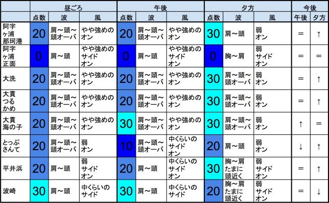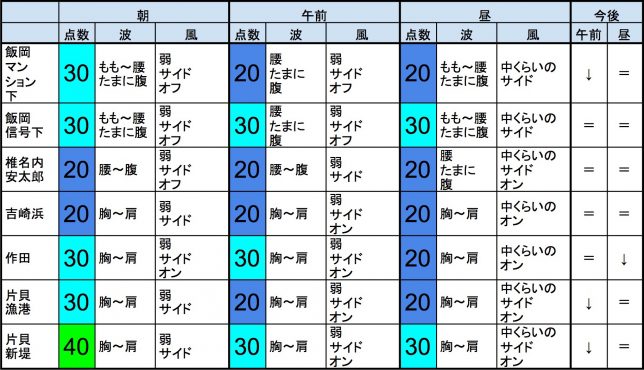 【千葉北 南部エリア】-・千葉北 南部エリアは胸〜肩〜頭近くくらいの波、弱めの風のスタート、多少できそうなコンディションで、午前から昼にかけてもコンディションはそのままキープしそうです。午後から夕方にかけてはコンディションは多少落ちそうです。-
