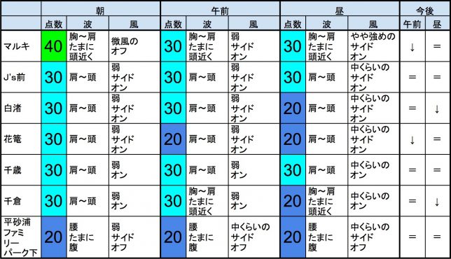 【千葉北 中央エリア】-・千葉北 中央エリアは胸〜肩〜頭近くくらいの波、弱めのオンショアベースの風のスタート、多少できそうなコンディションで、午前から昼にかけてコンディションは下向きそうです。午後から夕方にかけてもコンディションはそのままキープしそうです。-