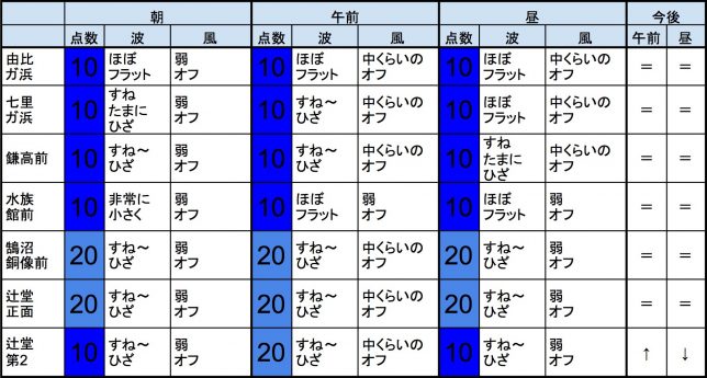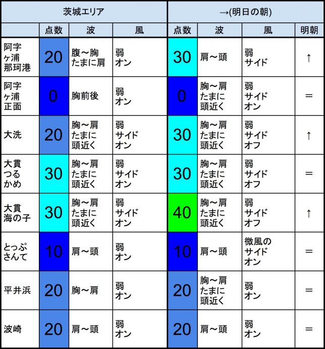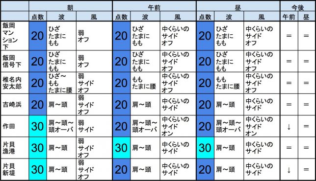 【千葉北 北部エリア】-“・千葉北 北部エリアは肩〜頭くらいの波、弱めのオフショアベースの風のスタート、それほど良くなくても多少できそうなコンディションで、午前から昼にかけてもコンディションはそのままキープしそうです。午後から夕方にかけてもコンディションはそのままキープしそうです。-