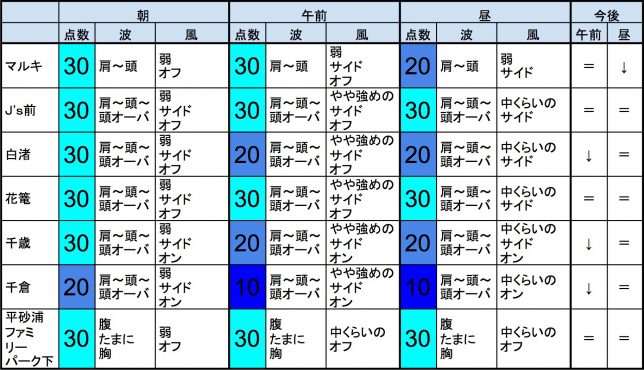 【千葉北 中央エリア】-・千葉北 中央エリアは肩〜頭〜頭オーバくらいの波、弱めのオンショアベースの風のスタート、それほど良くなくても多少できそうなコンディションで、午前から昼にかけてもコンディションはそのままキープしそうです。午後から夕方にかけてもコンディションはそのままキープしそうです。-