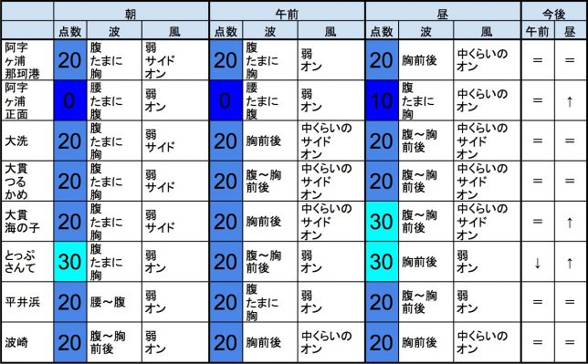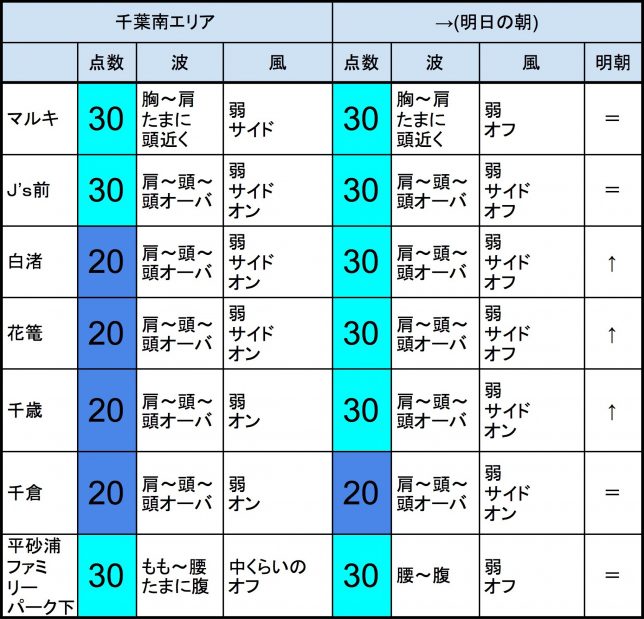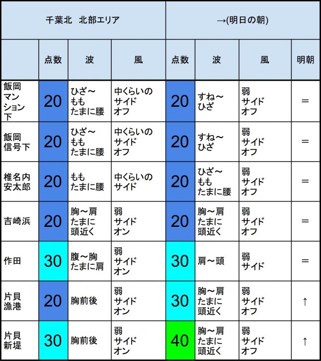 【千葉北 北部エリア】-“・明朝の千葉北 北部エリアは胸〜肩〜頭近くくらいの波、弱めのオフショアベースの風、それほど良くなくても多少できそうなコンディションでのスタートとなりそうです。-