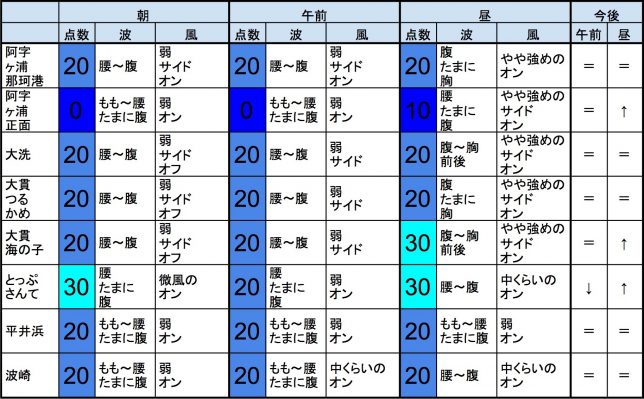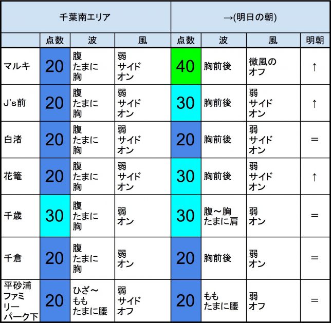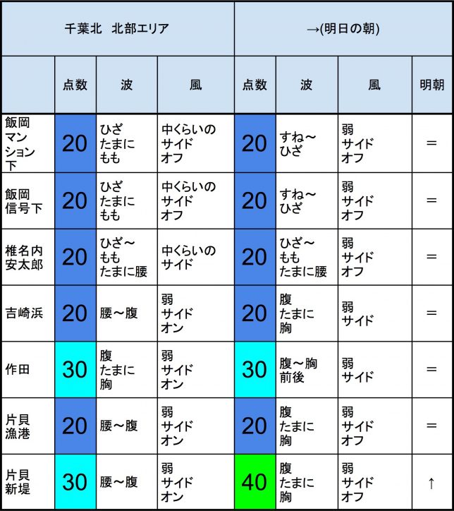 【千葉北 南部エリア】-・明朝の千葉北 南部エリアは腹〜胸前後くらいの波、弱めの風、それほど良くなくても多少できそうなコンディションでのスタートとなりそうです。-