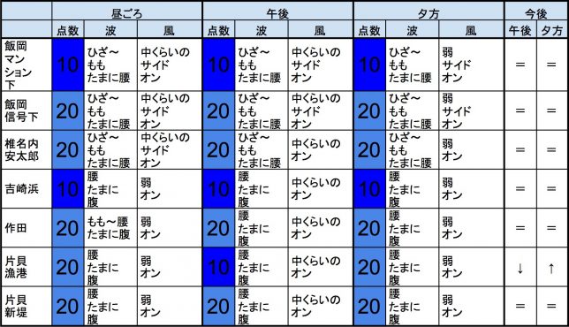【千葉北 南部エリア】-・千葉北 南部エリアはもも〜腰〜腹くらいの波、弱めのオンショアベースの風、いまいちなコンディションで、午後から夕方にかけても状況はあまり変わらなさそうです。-