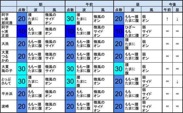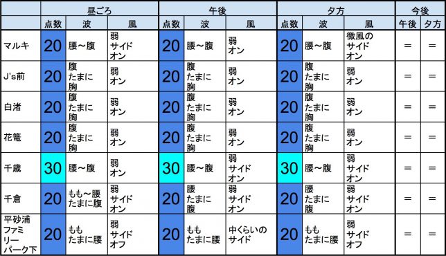 【千葉北 中央エリア】-・千葉北 中央エリアは腰〜腹くらいの波、弱めのオンショアベースの風、多少できそうなコンディションで、午後から夕方にかけてもコンディションはそのままキープしそうです。-